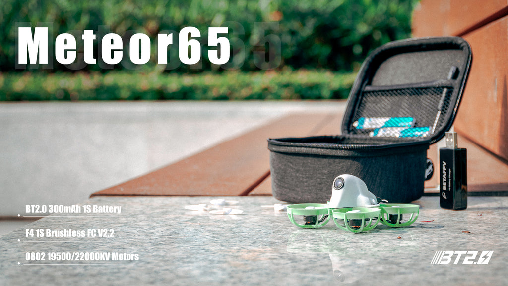 Meteor65 is the first generation whoop drone powered by brand-new BT2.0 1S battery. The BT2.0 connector effectively decreases internal connector resistance for a much better discharge performance compare with initial PH2.0 connector.