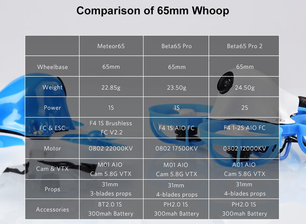 - Meteor65 lower profile frame is reduced 0.75g to 3.08g only. The battery slot is closer to the center of gravity for smoother flying experience, and you will land on the motor screws instead of the battery.